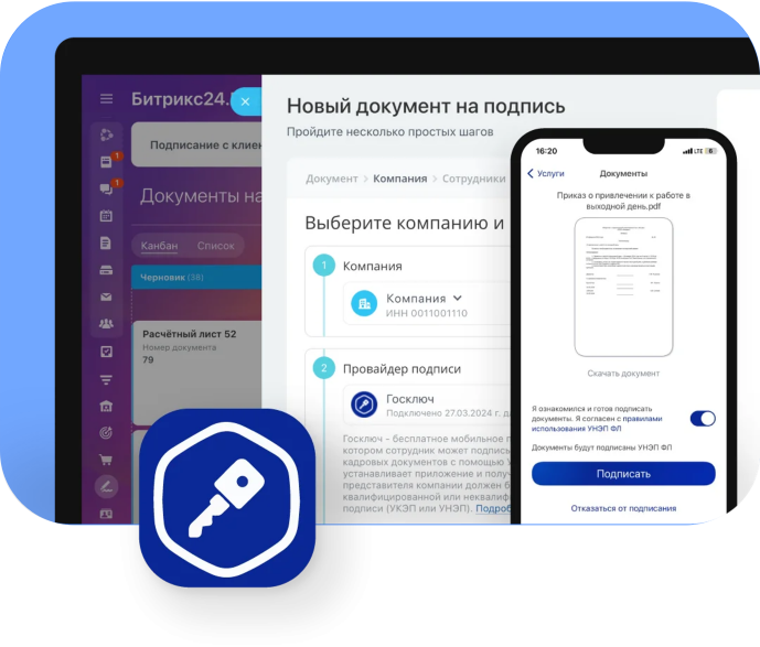 Нужно только подключить Госключ к вашему Битрикс24 в несколько простых шагов. Для подключения сотрудников понадобится только подтвержденный аккаунт на Госуслугах и смартфон.